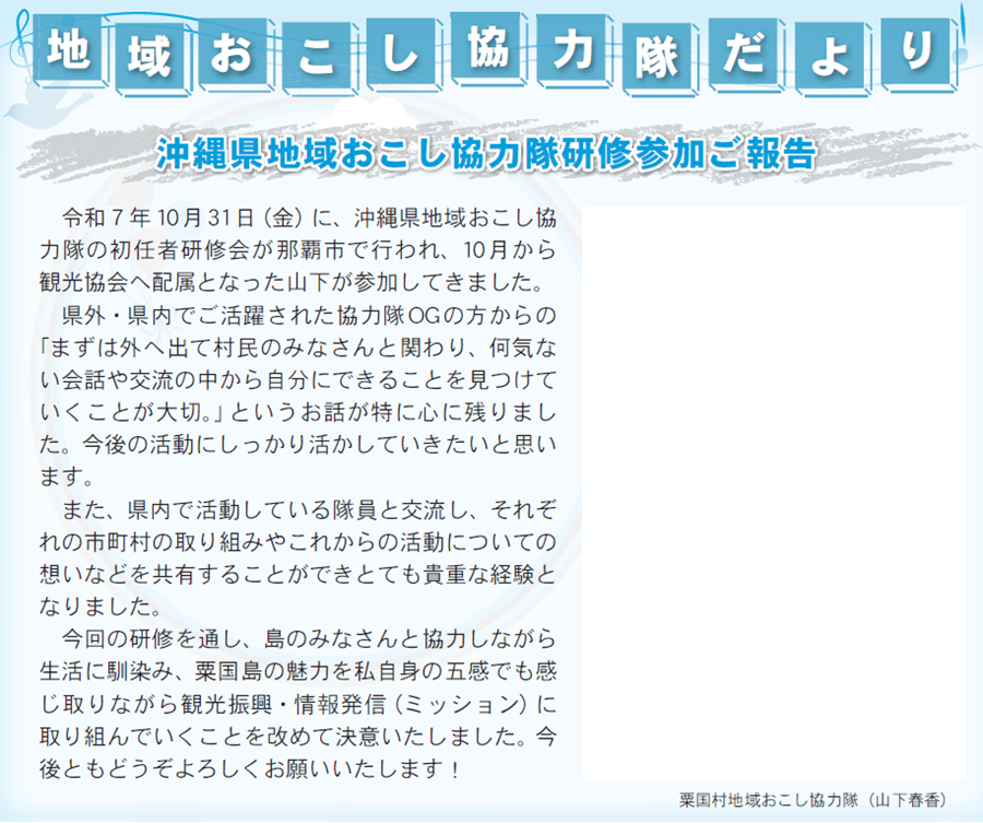 くらし 地域おこし協力隊だより 17/23 前の記事 次の記事 発行日 : 2026年01月01日 自治体名 : 沖縄県粟国村 広報紙名 : 広報あぐに 2026年1月号 Tweet シェアする 経済課だより(3) 教育委員会だより(2)