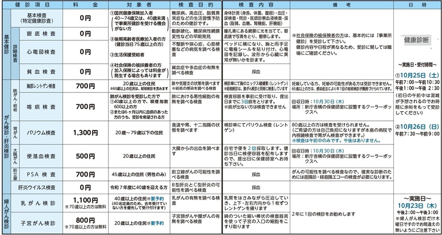 特定健診・がん検診の日程案内をいたします。国民健康保険に加入している20代30代の方も受けられます。年1回の集団健診はとても大切な機会です。健診で、あなたの身体をチェックしましょう!!