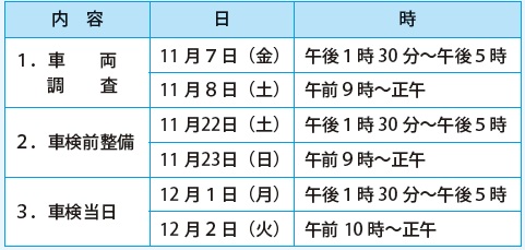 半年に一度、沖縄総合事務局による出張車検が下記日程で行なわれます。車検整備又は一般整備、抹消手続き等を受けられる方は、車検登録証及び自賠責保険証を持参の上、11月5日までに役場窓口でお申し込みいただきますようお願いいたします。