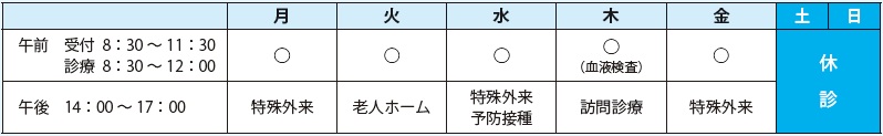(2)午後診療は特殊外来(専門医巡回診療・外科処置・禁煙外来・健康診断)および地域診療(老人ホーム、訪問診療、予防接種、会議など)となります。受診の希望がある場合には診療所まで連絡を下さい。