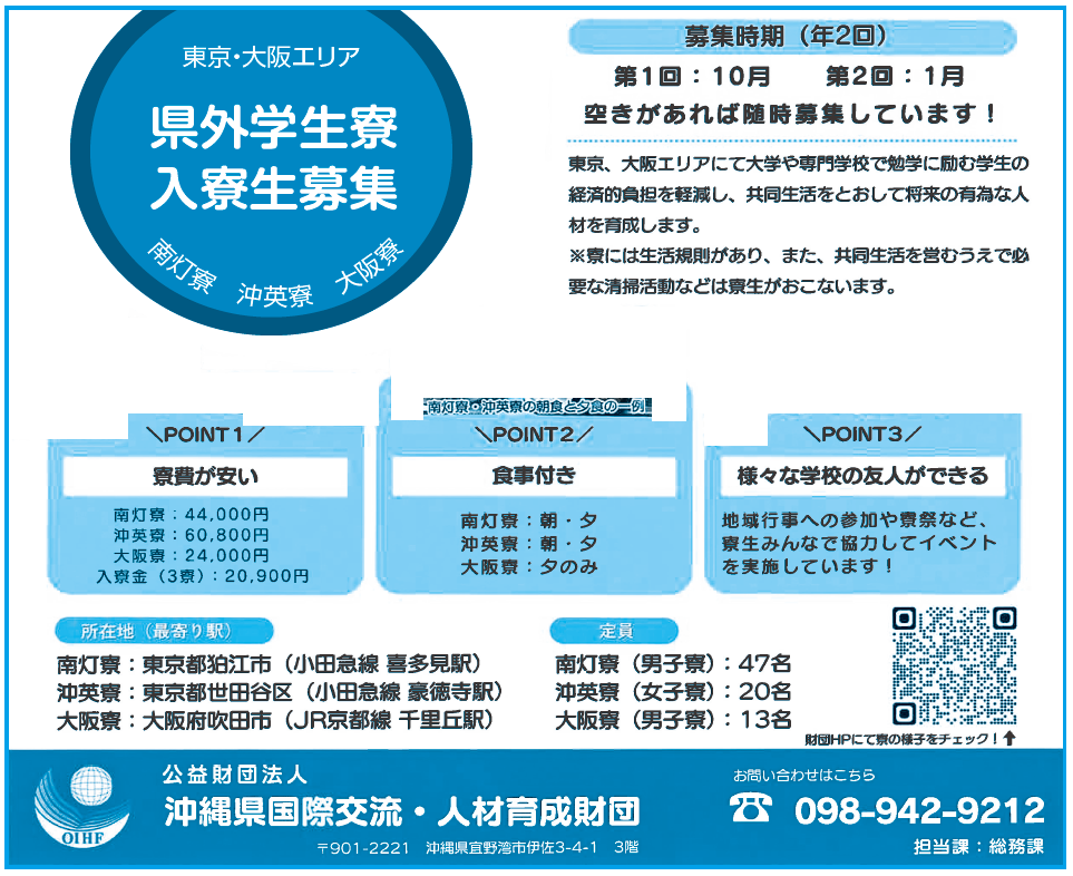 ◆東京・大阪エリア 県外学生寮 入寮生募集 南灯寮 沖英寮 大阪寮