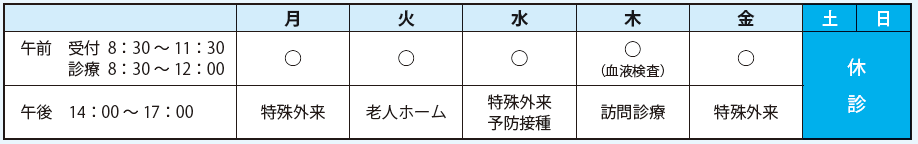 (2)午後診療は特殊外来(専門医巡回診療・外科処置・禁煙外来・健康診断)および地域診療(老人ホーム、訪問診療、予防接種、会議など)となります。受診の希望がある場合には診療所まで連絡を下さい。