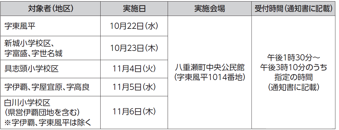 ・日程は字の人数ごとに分かれております。希望する学校区とは異なる日程でも支障はありませんので、できる限り決められた日程で受診してください。