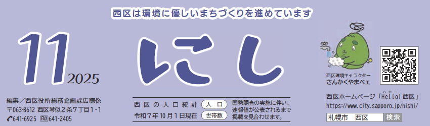 その他のお知らせ(広報さっぽろ 西区 2025年11月号) ◆西区は環境に優しいまちづくりを進めています ◆西区の人口統計 令和7年10月1日現在 人口・世帯数:国勢調査の実施に伴い、速報値が公表されるまで掲載を見合わせます。 ◆西区ホームページ「Hello(ハロー)!西区」 【URL】https://www.city.sapporo.jp/nishi/ 「札幌市 西区」で検索 編集:西区役所総務企画課広聴係 〒063-8612 西区琴似2条7丁目1-1 ...