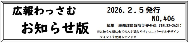 その他のお知らせ(広報わっさむ お知らせ版 令和8年2月5日号) 2026.2.5発行 NO.406 編集:総務課情報防災安全係 【電話】32-2421 ※お知らせ版は全ての人が読みやすいユニバーサルデザインフォントを使用しています