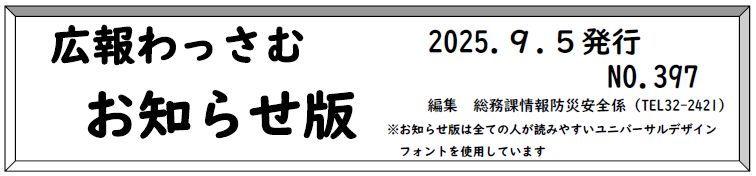 その他のお知らせ(広報わっさむ お知らせ版 令和7年9月5日号) 2025.9.5発行 NO.397 編集:総務課情報防災安全係 【電話】32-2421 ※お知らせ版は全ての人が読みやすいユニバーサルデザインフォントを使用しています