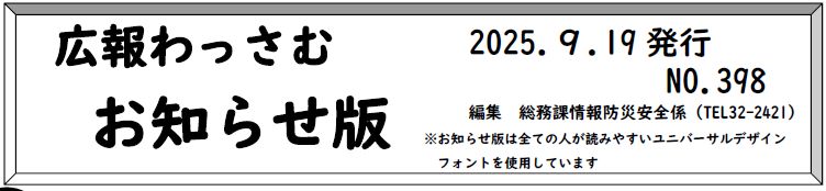 その他のお知らせ(広報わっさむ お知らせ版 令和7年9月19日号) 2025.9.19発行 NO.398 編集:総務課情報防災安全係 【電話】32-2421 ※お知らせ版は全ての人が読みやすいユニバーサルデザインフォントを使用しています