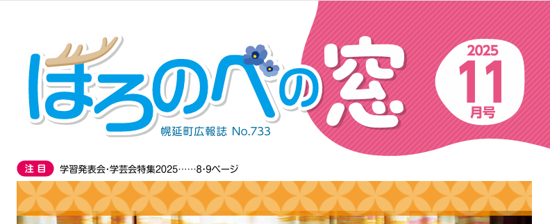 その他のお知らせ(ほろのべの窓 令和7年11月号 No.733) ■今月の表紙 幌延小学校学習発表会、6年生合唱の一場面です。 堂々と合唱する姿は、子どもの成長を感じさせる立派な姿でした。 ■幌延町ウェブサイト 【HP】https://www.town.horonobe.jp/ ■この広報誌は、読みやすさに配慮したユニバーサルデザインフォントを採用しています。 ■この広報誌は、資源保護のため再生紙を利用しています。 ■広報へのご意見、ご要望をお寄せください 総務...