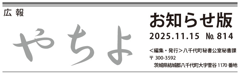 その他のお知らせ(広報やちよ お知らせ版 11月15日号(令和7年度)) ■広報やちよ お知らせ版 2025.11.15 No.814 編集・発行:八千代町秘書公室秘書課 〒300-3592 茨城県結城郡八千代町大字菅谷1170番地 問合せ:八千代町役場 【電話】0296-48-1111(代表) 役場へのお電話は、代表番号におかけのうえ、電話交換担当に内線番号をお申し付けください。 【HP】https://www.town.ibaraki-yachiyo.lg.jp 【...