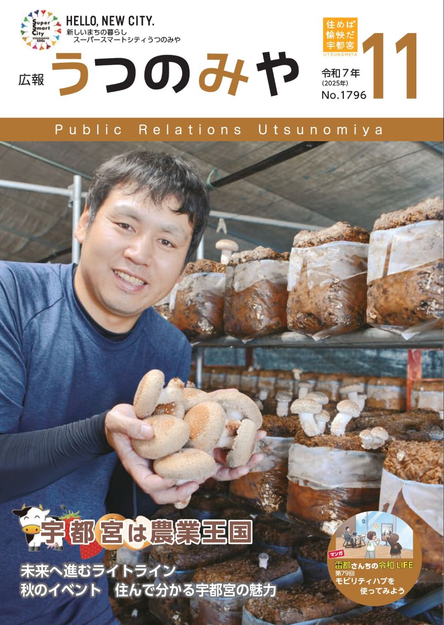今月の表紙 宇都宮ブランド農産物「宮どんこ」の生産者です。「宮どんこ」は、かさの直径が6cm以上8cm以下、かさの厚み2cm以上の最上級品の生シイタケです。11月の地産地消月間を機に、宇都宮ブランド農産物を知って、買って、食べてみるのはいかがでしょうか。詳しくは、2~5ページをご覧ください。