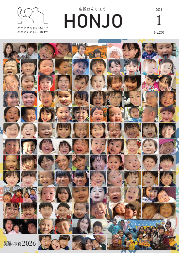 今月の表紙 毎年恒例となる「笑顔の写真」が、今年も広報ほんじょう新年号の表紙を飾りました。 たくさんのご応募ありがとうございました!