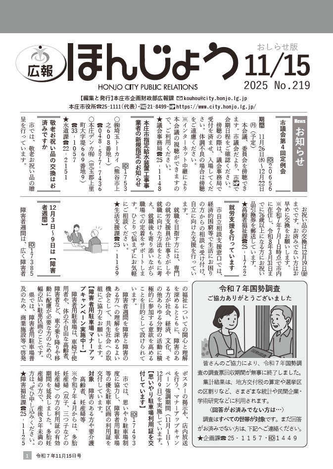 その他のお知らせ(広報ほんじょう おしらせ版 2025年11月15日号) ■広報ID、ご活用ください 市からのお知らせ記事に記載している「【ID】●●●●」を市HPトップの広報ID検索欄に入力するだけで、詳細記事へアクセスできます。 ■広報ほんじょう おしらせ版11/15 2025No.219 編集と発行:本庄市企画財政部広報課【E-mail】[email protected] 本庄市役所【電話】25-1111(代表)【FAX】21-8499【HP】http...