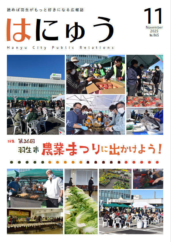 こんにちは!市長です。Hello,everyone! 喜右エ門新田地区の秋祭りに参加。10月12日(日)の夜に開催され、子どもから年配の方まで多くの地域の方でにぎわいました。祭りの最後を飾ったのは、羽生市こども歌舞伎保存会の「白浪五人男」。子どもたちの力の入った演技に地域が一つになっているのを感じました。市は今後も、地域の伝統文化・行事の継承と発展を推進し、子どもたちの郷土愛を育んでまいります。 今月の特集は農業まつりです。農業振興と活性化のため、毎...