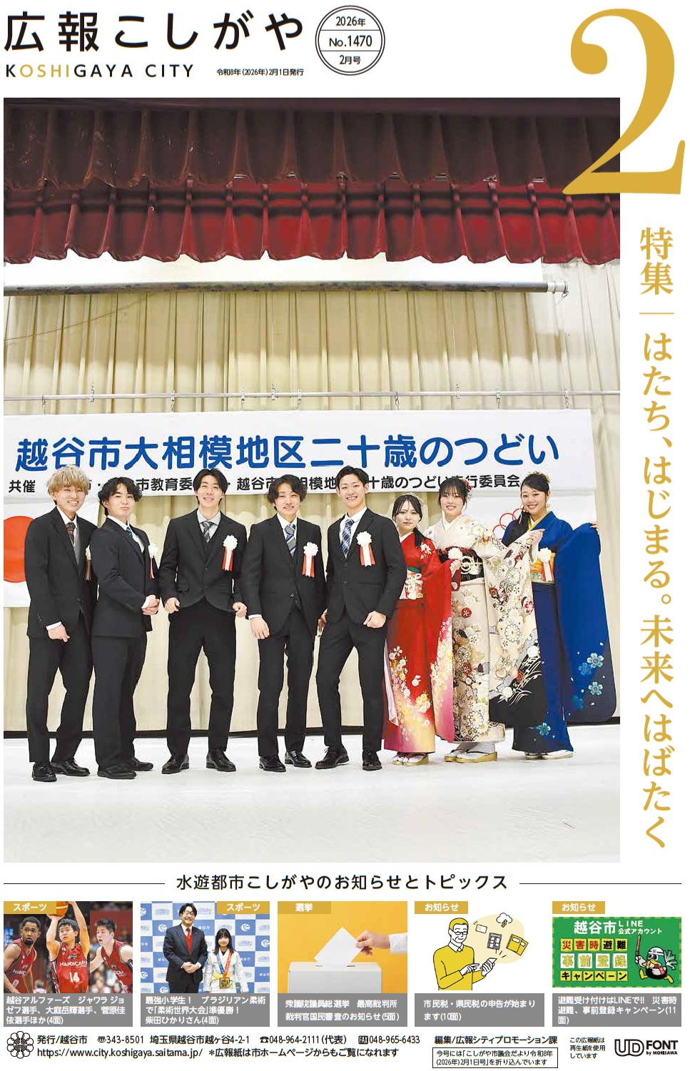 越谷市二十歳(はたち)のつどい はたち、はじまる。未来へはばたく(1) 1月11日、市内11会場で越谷市二十歳のつどいが開催され、2,225人が出席しました。各地区の地域の皆さんと二十歳の皆さんが、二十歳のつどい実行委員会として検討を重ね準備をしてきた成果が実り、各会場は一体となって盛り上がりました。 華やかな衣装や凜とした表情で二十歳の若者が集まった南越谷地区と大相模地区の会場の熱気をレポートし、新しい門出を迎えた今のキモチを聞いてきました。 ■越谷市二十歳のつどい...
