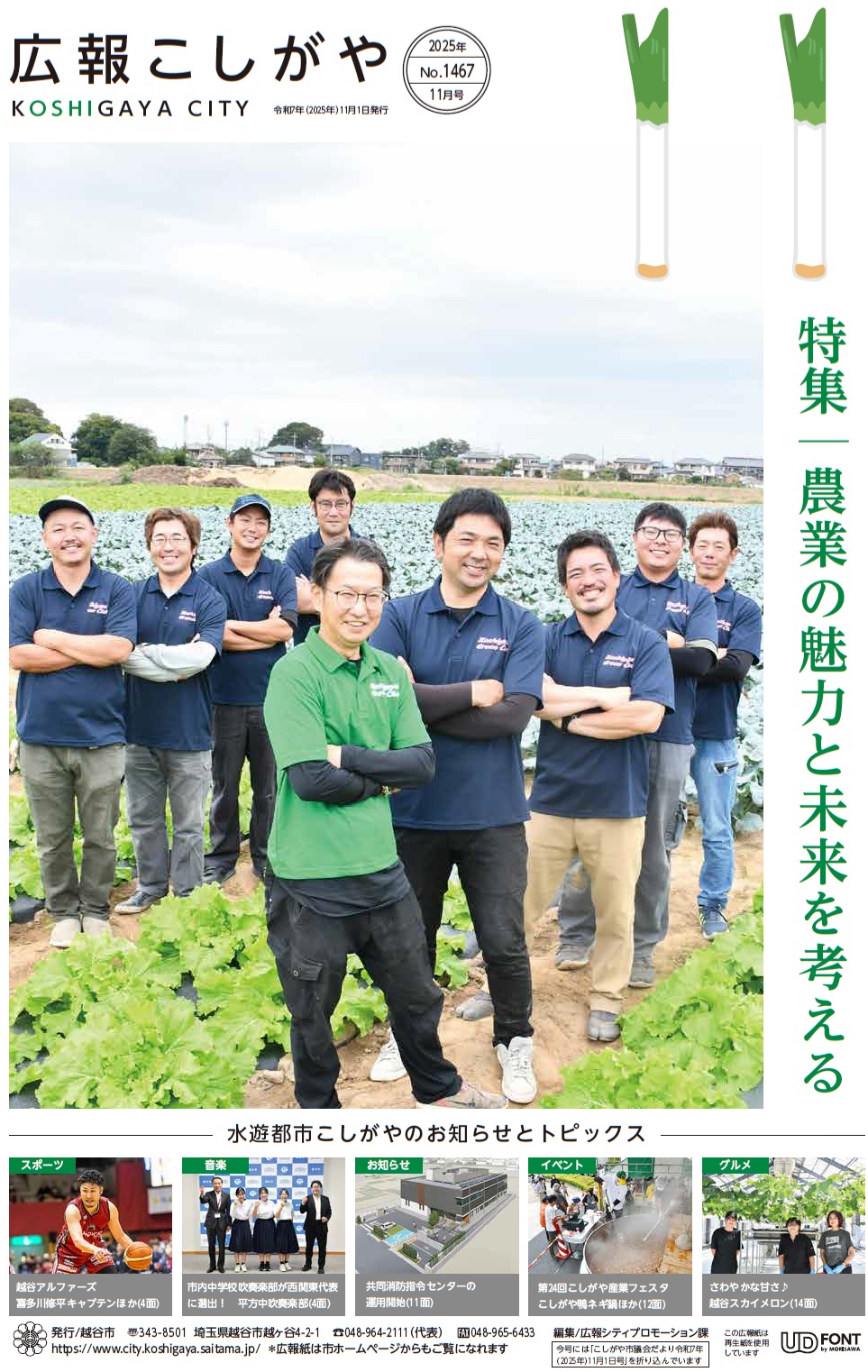 特集―農業の魅力と未来を考える(1) ■農業を未来につなぐ 越谷市は、豊かな自然や農業と都市近郊の便利な暮らしが共存するまちです。 地域の暮らしを支え、地域の魅力をかたちづくる農業の未来を若手農業者の皆さんと考えます。 ▼若手農業者にインタビュー ○大熊良幸(おおくまよしゆき)さん(42歳) ・代々続く農家を継ぎました、課題は担い手不足 曽祖父から続く農家で生まれ育ちました。家業を継ぐことを意識したのは、中学生のときですかね。農業に関...