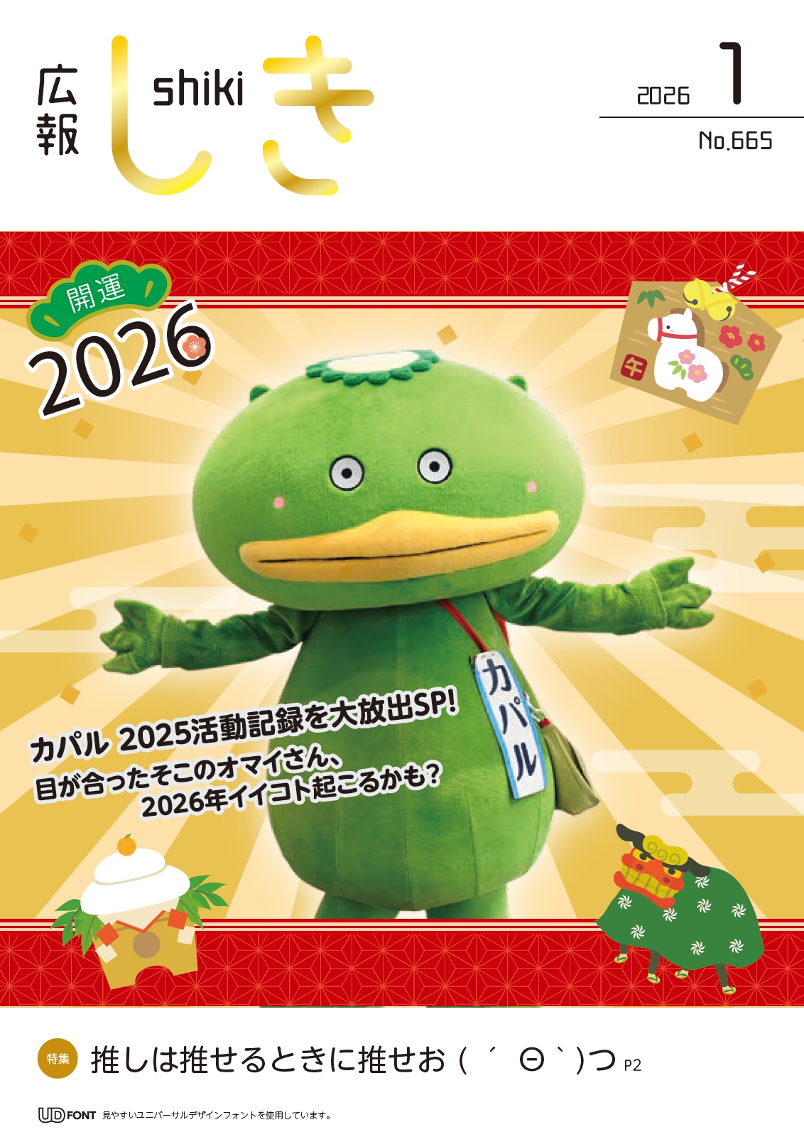 「広報しき」に関するアンケートにご協力ください 広報しきに関して、皆さんがどのように感じているかを把握し、さらにわかりやすい広報紙面を検討するために実施するものです。 ご回答いただいた皆さんの中から抽選で1名様に「カパルトートバッグ」をプレゼントします。皆さんのご意見をお待ちしています。 ●回答方法 1月31日(土)(当日消印有効)までに住所・氏名・電話番号・アンケートの回答を記入のうえ、ハガキ、メールまたは回答フォームからご回答ください。 *...