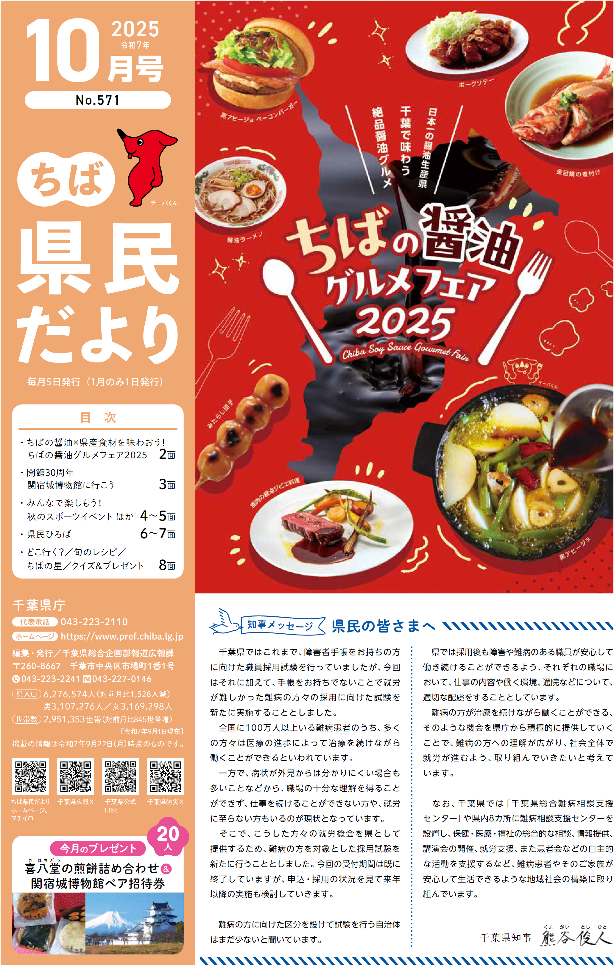 その他のお知らせ(ちば県民だより 令和7年10月号) 県人口:6,276,574人(対前月比1,528人減) 男3,107,276人/女3,169,298人 世帯数:2,951,353世帯(対前月比845世帯増) [令和7年9月1日現在] 掲載の情報は令和7年9月22日(月)時点のものです。 ・ちば県民だよりホームページ、マチイロ ・千葉県広報X ・千葉県公式LINE ・千葉県防災X (※本紙二次元コード参照) ■今月のプレゼント 喜八堂(きはちどう...