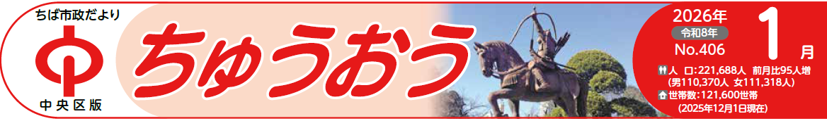 その他のお知らせ(ちば市政だより 中央区版 令和8年1月号) ■ちば市政だより 2026年1月号 中央区版 2026年1月1日(木曜日) No.406(毎月1日発行) ■人口など 人口:221,688人 前月比95人増 (男110,370人 女111,318人) 世帯数:121,600世帯 (2025年12月1日現在) ■中央区役所 【電話】043-221-2111(代表) 〒260-8733千葉市中央区中央4丁目5番1号(きぼーる11階) 「千葉市 中央区...