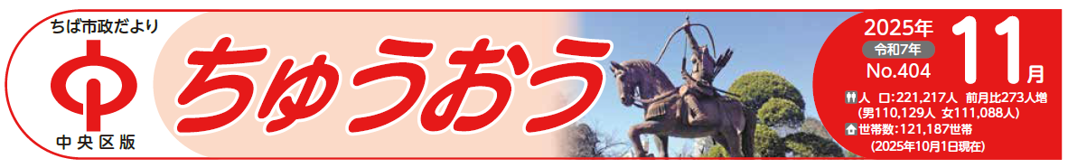 その他のお知らせ(ちば市政だより 中央区版 令和7年11月号) ■ちば市政だより 2025年11月号 中央区版 2025年11月1日(土曜日) No.404(毎月1日発行) ■人口など 人口:221,217人 前月比273人増 (男110,129人 女111,088人) 世帯数:121,187世帯 (2025年10月1日現在) ■中央区役所 【電話】043-221-2111(代表) 〒260-8733 千葉市中央区中央4丁目5番1号(きぼーる11階) 「千葉市...