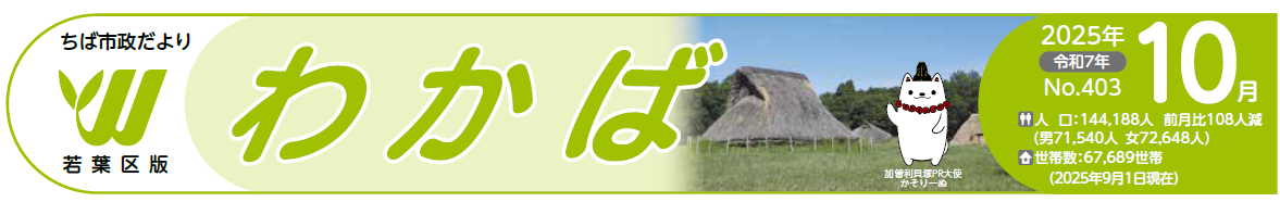 その他のお知らせ(ちば市政だより 若葉区版 令和7年10月) ■ちば市政だより 2025年10月号 若葉区版 2025年10月1日(水曜日) No.403(毎月1日発行) ■人口など 人口:144,188人 前月比108人減 (男71,540人 女72,648人) 世帯数:67,689世帯 (2025年9月1日現在) ■若葉区役所 【電話】043-233-8111(代表) 〒264-8733 千葉市若葉区桜木北2丁目1番1号 「千葉市 若葉区役所」で検索 ■...