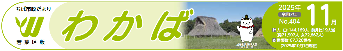 その他のお知らせ(ちば市政だより 若葉区版 令和7年11月号) ■ちば市政だより 2025年11月号 若葉区版 2025年11月1日(土曜日) No.404(毎月1日発行) ■人口など 人口:144,169人 前月比19人減 (男71,507人 女72,662人) 世帯数:67,726世帯 (2025年10月1日現在) ■若葉区役所 【電話】043-233-8111(代表) 〒264-8733 千葉市若葉区桜木北2丁目1番1号 「千葉市 若葉区役所」で検索 ■...
