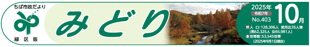 その他のお知らせ(ちば市政だより 緑区版 令和7年10月号) ■ちば市政だより 2025年10月号 緑区版 2025年10月1日(水曜日) No.403(毎月1日発行) ■人口など 人口:128,306人 前月比35人増 (男62,325人 女65,981人) 世帯数:53,545世帯 (2025年9月1日現在) ■緑区役所 【電話】043-292-8111(代表) 〒266-8733 千葉市緑区おゆみ野3丁目15番地3 「千葉市 緑区役所」で検索 ■区版編...
