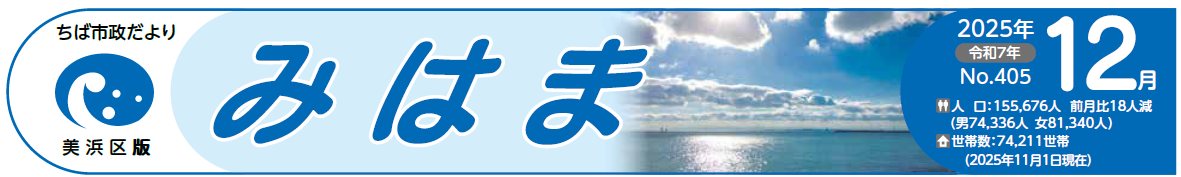 その他のお知らせ(ちば市政だより 美浜区版 令和7年12月号) ■ちば市政だより 2025年12月号 美浜区版 2025年12月1日(月曜日) No.405(毎月1日発行) ■人口など 人口:155,676人 前月比18人減 (男74,336人 女81,340人) 世帯数:74,211世帯 (2025年11月1日現在) ■美浜区役所 【電話】043-270-3111(代表) 〒261-8733 千葉市美浜区真砂5丁目15番1号 「千葉市 美浜区役所」で検索 ■...
