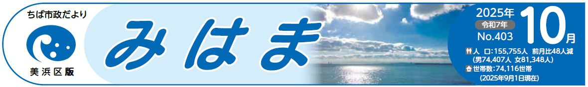 その他のお知らせ(ちば市政だより 美浜区版 令和7年10月号) ■ちば市政だより 2025年10月号 美浜区版 2025年10月1日(水曜日) No.403(毎月1日発行) ■人口など 人口:155,755人 前月比48人減 (男74,407人 女81,348人) 世帯数:74,116世帯 (2025年9月1日現在) ■美浜区役所 【電話】043-270-3111(代表) 〒261-8733 千葉市美浜区真砂5丁目15番1号 「千葉市 美浜区役所」で検索 ■区...