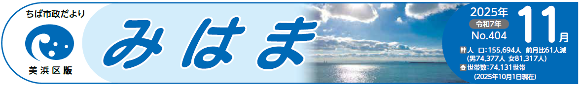 その他のお知らせ(ちば市政だより 美浜区版 令和7年11月号) ■ちば市政だより 2025年11月号 美浜区版 2025年11月1日(土曜日) No.404(毎月1日発行) ■人口など 人口:155,694人 前月比61人減 (男74,377人 女81,317人) 世帯数:74,131世帯 (2025年10月1日現在) ■美浜区役所 【電話】043-270-3111(代表) 〒261-8733 千葉市美浜区真砂5丁目15番1号 「千葉市 美浜区役所」で検索 ■...