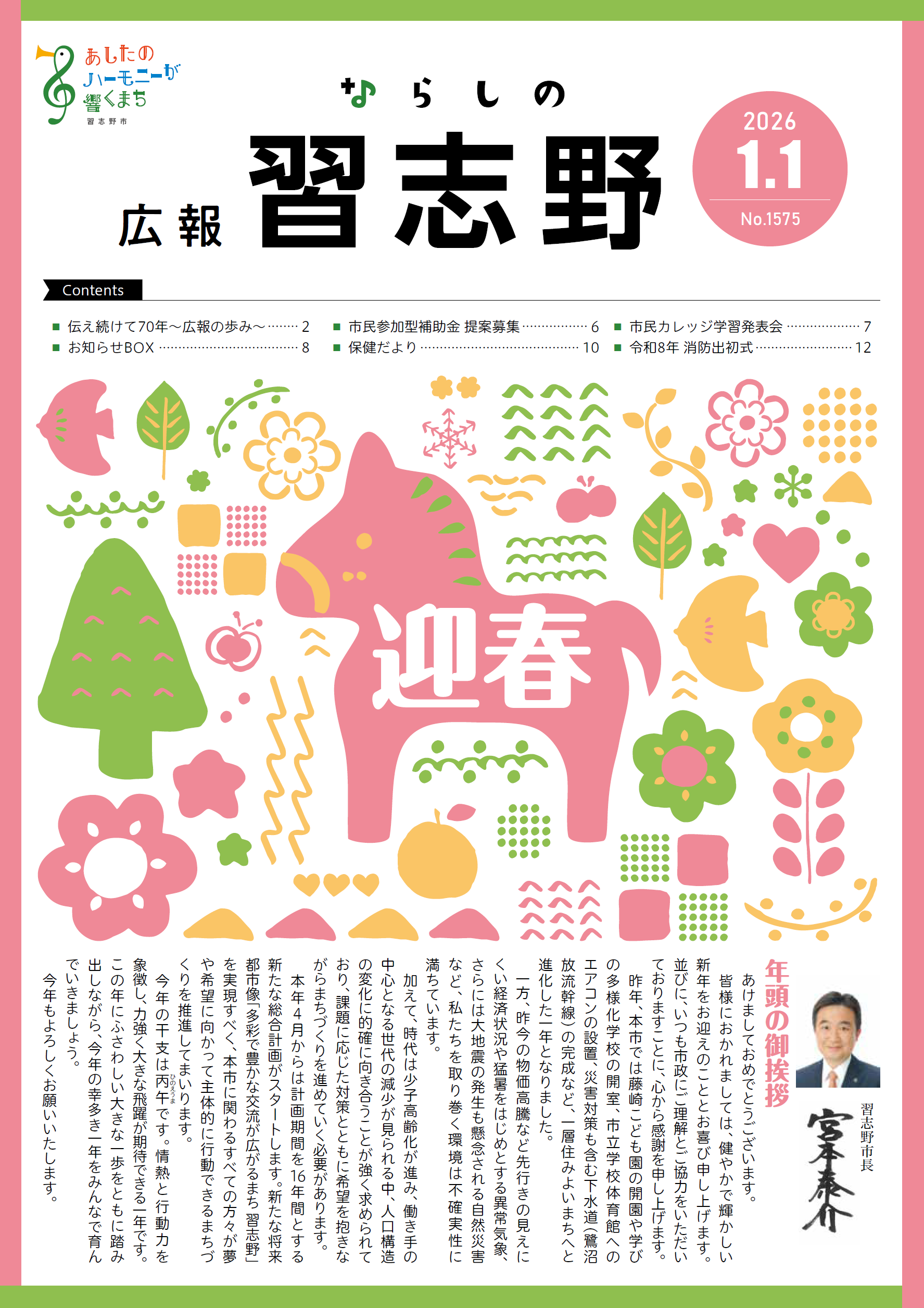 年頭の御挨拶 習志野市長 宮本泰介 あけましておめでとうございます。 皆様におかれましては、健やかで輝かしい新年をお迎えのこととお喜び申し上げます。並びに、いつも市政にご理解とご協力をいただいておりますことに、心から感謝を申し上げます。 昨年、本市では藤崎こども園の開園や学びの多様化学校の開室、市立学校体育館へのエアコンの設置、災害対策も含む下水道(鷺沼放流幹線)の完成など、一層住みよいまちへと進化した一年とな...