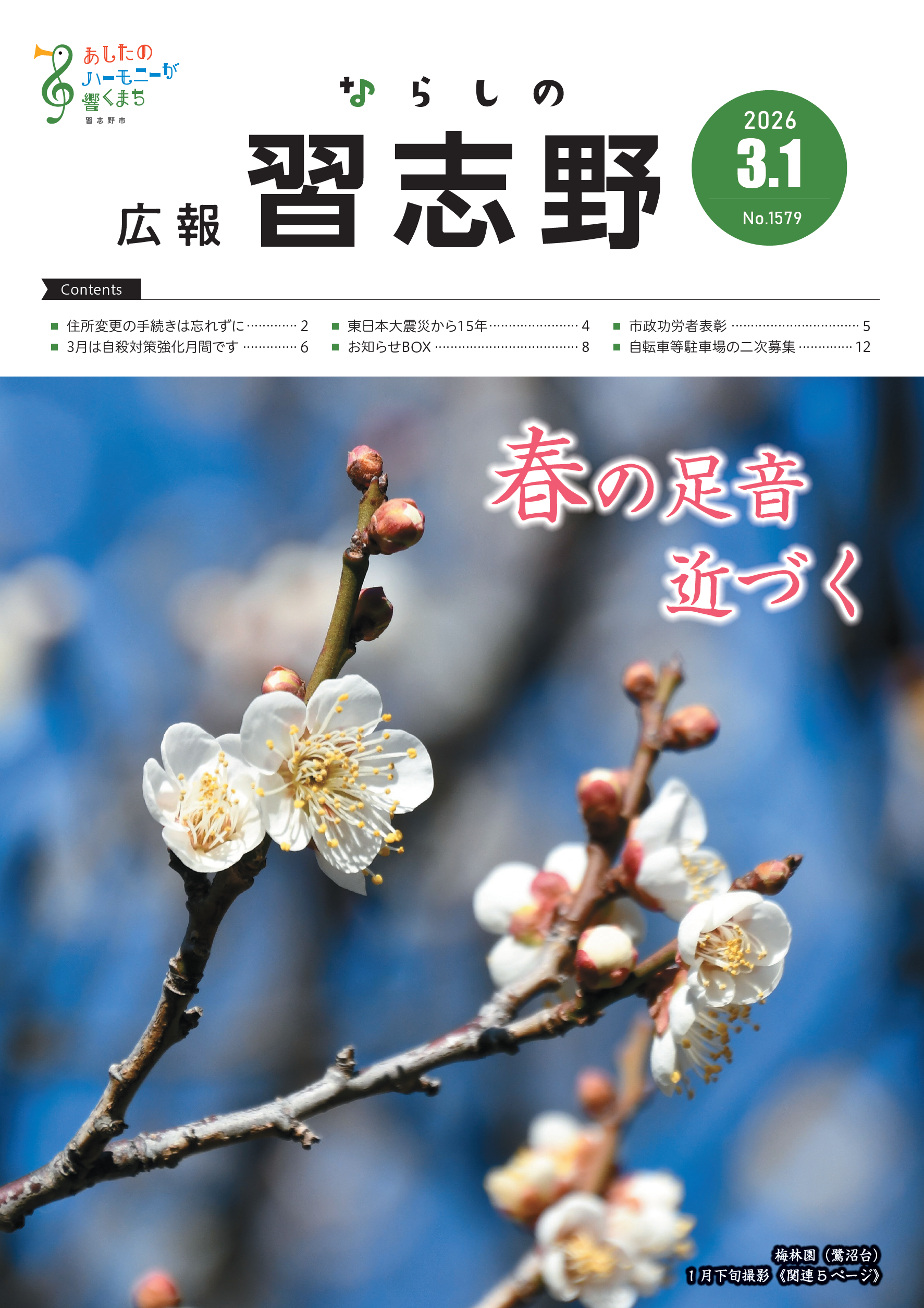 お知らせBOXー市役所からー 市役所への問い合わせ:【電話】047-451-1151(代) 市役所への郵便物:〒275-8601「習志野市役所〇〇課」で届きます ■都市計画生産緑地地区の変更(案)の縦覧 ◇縦覧 日時:3月13日(金)~27日(金)(土・日曜日、祝日を除く) ◇意見書の提出 対象者:市内在住、利害関係のある人(法人可) 申込み:所定の用紙(窓口にて配布、市ホームページ掲載)を持参または郵送で 〒275-8601...