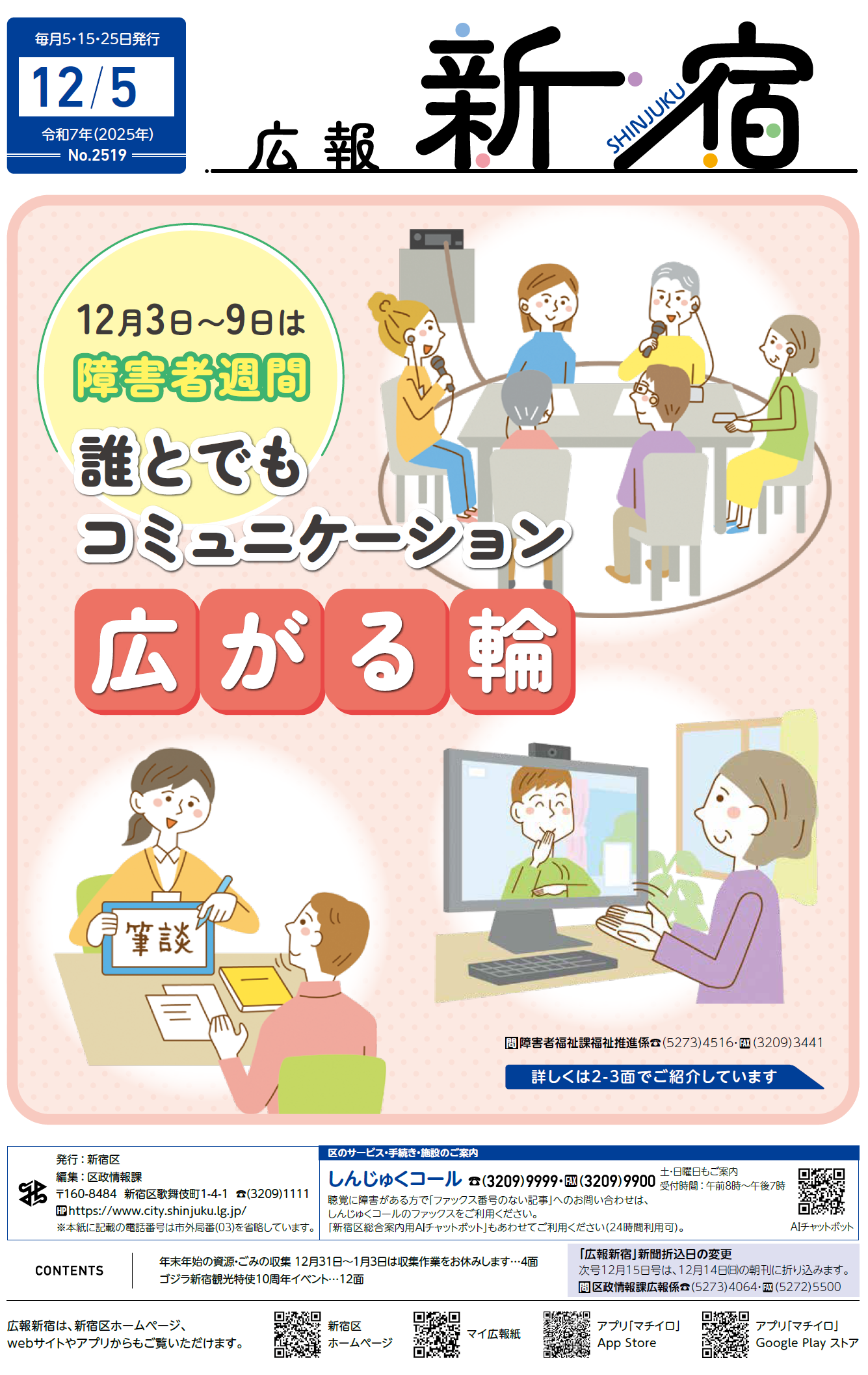 12月3日〜9日は障害者週間 誰とでもコミュニケーション 広がる輪 詳しくは本紙2-3面でご紹介しています 問合せ:障害者福祉課福祉推進係 【電話】5273-4516【FAX】3209-3441