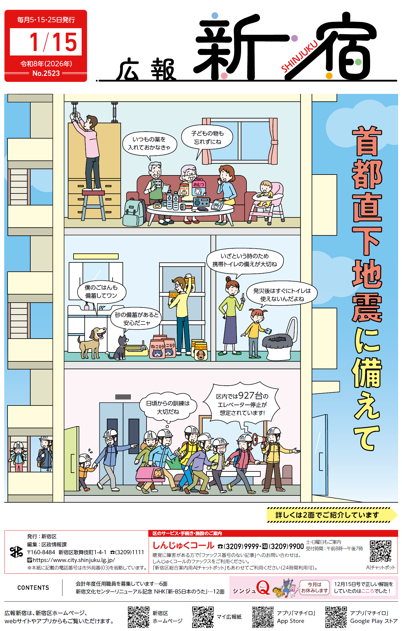 首都直下地震に備えて ・いつもの薬を入れておかなきゃ ・子どもの物も忘れずにね ・僕のごはんも備蓄してワン ・砂の備蓄があると安心だニャ ・いざという時のため携帯トイレの備えが大切ね ・発災後はすぐにトイレは使えないんだよね ・日頃からの訓練は大切だね ・区内では927台のエレベーター停止が想定されています! 詳しくは本紙2面でご紹介しています