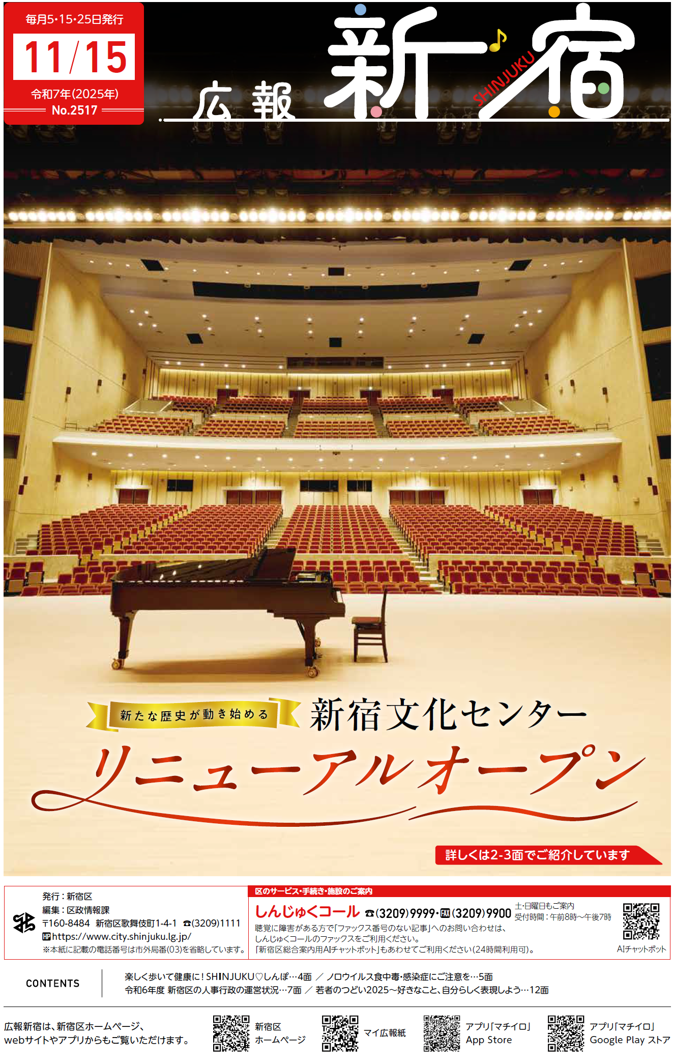新しくなった新宿文化センターを徹底紹介 10月にリニューアルオープンした同センター。リニューアルオープンにあたり、同センターと縁ゆかりのある方々からお祝いのメッセージをお寄せいただきました。今号では、お寄せいただいたメッセージとともに、歴史と新たな魅力や今後の催し等をご紹介します。 ■開館46年の歴史を辿(たど)る 同センターの開館からリニューアルオープンまでの記録や記念イベント等を辿ります。 ・昭和54年 開館 ・昭和59年 5周年 ...