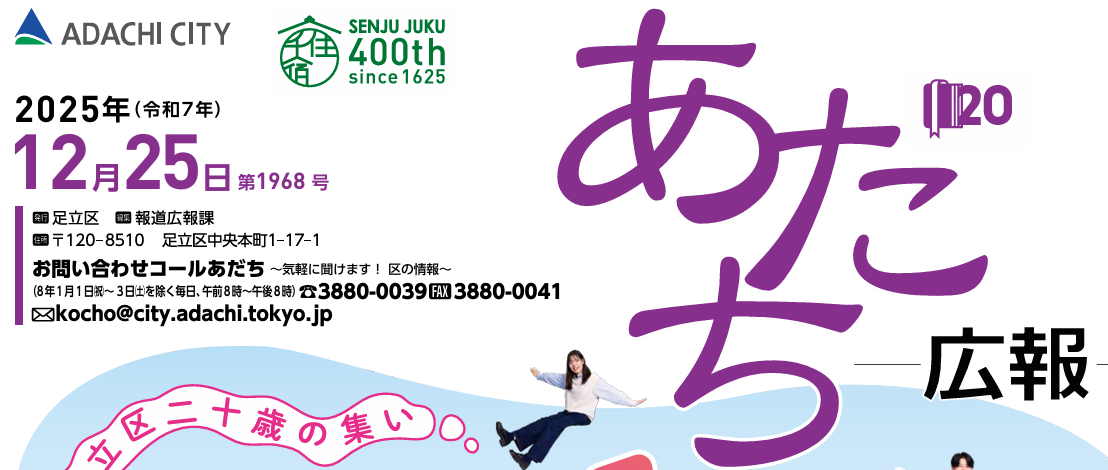 足立区二十歳の集い 未来に羽ばたく1ページ 2026年1月12日(祝) 午前11時から午後0時30分 受付開始:午前10時 場所:東京武道館(綾瀬3丁目20番1号/綾瀬駅東口から徒歩5分) 都立東綾瀬公園(ハト広場)にフォトスポットもあるよ! 対象:平成17年4月2日から18年4月1日生まれの方(対象者には案内状を送付済み) ※「二十歳(はたち)の集い」は20歳の有志による実行委員会で企画しています。表紙のモデルはその実行委員です。 協力企...