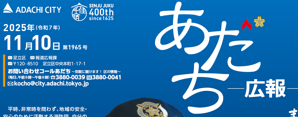 まちを守る、まちの人 私たち、消防団 平時、非常時を問わず、地域の安全・安心のために活動する消防団。自分の住む地域に消防団があることを知ってはいても、具体的な活動内容までは知らないという方が多いのでは?今号では、区内にある3つの消防団で活躍する方々に、活動内容や活動への想(おも)いを伺いました。 くわしくは本紙6・7面へ 問い合わせ先:(足立区)災害対策係 【電話】03-3880-5836
