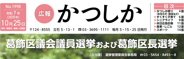 葛飾区議会議員選挙および葛飾区長選挙(1) 日時:11月9日(日曜日) 午前7時~午後8時 その一票 この葛飾(まち)変える 鍵になる ■投票できる方 ・平成19年11月10日までに生まれた日本国民で、令和7年8月1日までに葛飾区に転入の届け出をし、選挙人名簿に登録されている方 字が書けない方や身体に障害がある方は、代理・点字投票ができます。投票所の係員にお申し出ください。 ■投票には「選挙のお知らせ」を忘れずに 10月30日(木曜日)から...