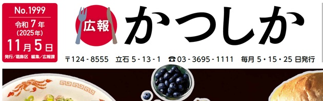 〔今年は何食べる?〕かつしかフードフェスタ2025 日時:11月15日(土曜日)・16日(日曜日) 午前10時~午後4時 会場:新小岩公園 (西新小岩1-1-3) 出店する店舗やステージイベントの情報など、詳しくは(本紙)2面で紹介しています 担当課:商工振興課 【電話】03-3838-5559