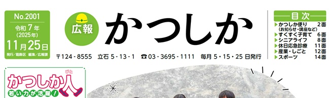 〔かつしか便り 区からのお知らせ・講座など〕講座・講演会 ◆ハガキ・ファクス・メールなどの記入事項 (1)イベント・講座(コース)名 (2)住所 (3)参加者全員の氏名(フリガナ) (4)年齢(お子さんは学年も) (5)電話番号(ファクス番号) (6)その他(各記事に掲載) ※原則、重複申し込みはできません。 ■図書館×講談+終戦80年 貞花先生、平和を語る 講談師の一龍斎貞花氏の講談を聞きます。 日時:12月13日(土曜日) 午後2時開演 直接会場へ(...