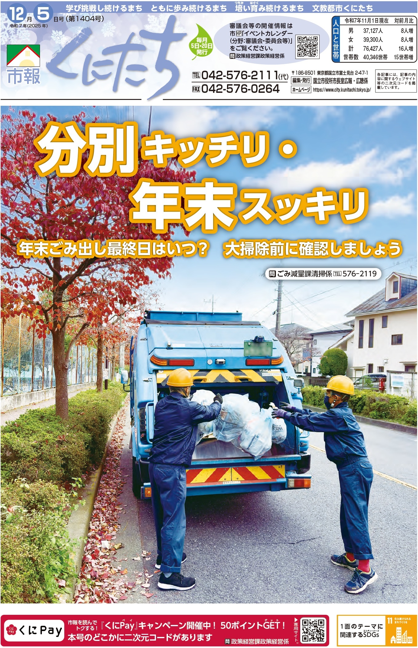 その他のお知らせ(市報くにたち 令和7年12月5日号(第1404号)) ◆学び挑戦し続けるまち ともに歩み続けるまち 培(つちか)い育(はぐく)み続けるまち 文教都市くにたち ◆審議会等の開催情報は市HP「イベントカレンダー(分野:審議会・委員会等)」をご覧ください。 問合せ:政策経営課政策経営係 ◆人口と世帯 令和7年11月1日現在 対前月比 男:37,127人 8人増 女:39,300人 8人増 計:76,427人 16人増 世帯数:40,346世帯 15世帯増 ...