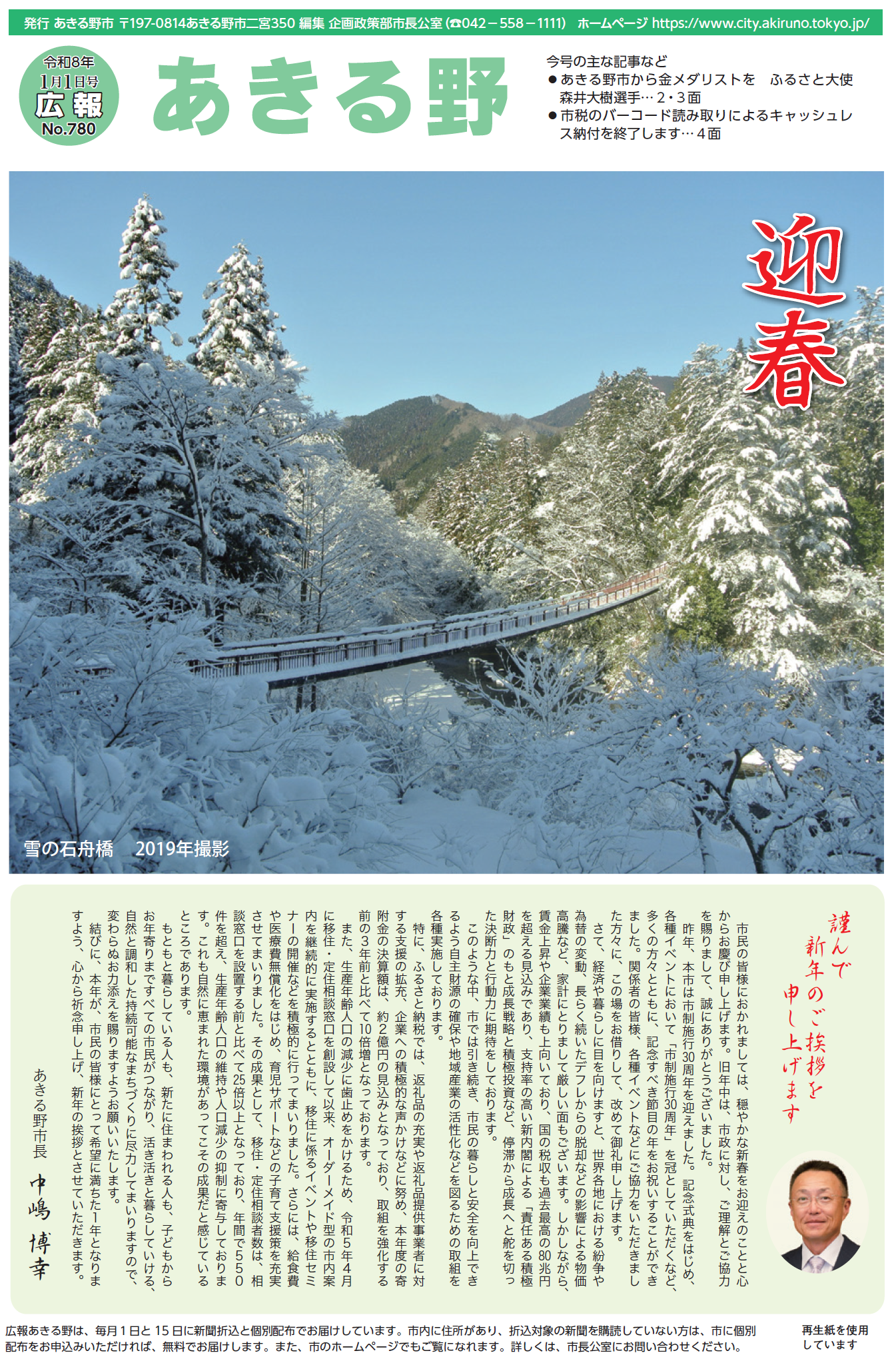 その他のお知らせ(広報あきる野 2026年1月1日号) ・広報あきる野は、毎月1日と15日に新聞折込と個別配布でお届けしています。市内に住所があり、折込対象の新聞を購読していない方は、市に個別配布をお申込みいただければ、無料でお届けします。また、市のホームページでもご覧になれます。詳しくは、市長公室にお問い合わせください。 ・再生紙を使用しています ・あきる野市役所【電話】042-558-1111(代) ・広報あきる野 令和8年1月1日号 No.780...