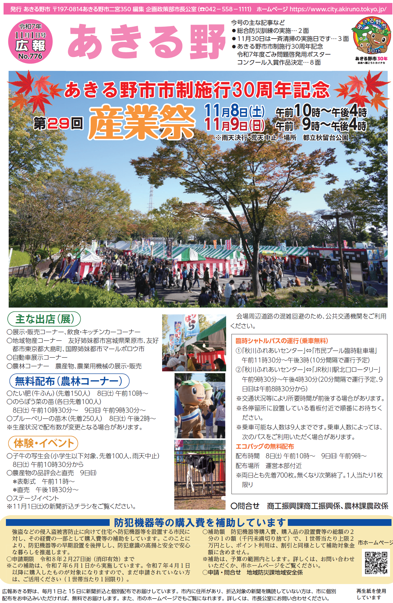 あきる野市市制施行30周年記念 第29回 産業祭 11月8日(土)午前10時~午後4時 11月9日(日)午前9時~午後4時 ※雨天決行・荒天中止 場所:都立秋留台公園 ■主な出店(展) ・展示・販売コーナー、飲食・キッチンカーコーナー ・地域物産コーナー 友好姉妹都市宮城県栗原市、友好都市東京都大島町、国際姉妹都市マールボロウ市 ・自動車展示コーナー ・農林コーナー 農産物、農業用機械の展示・販売 ■無料配布(農林コーナー) ・たい肥(牛ふん)(...