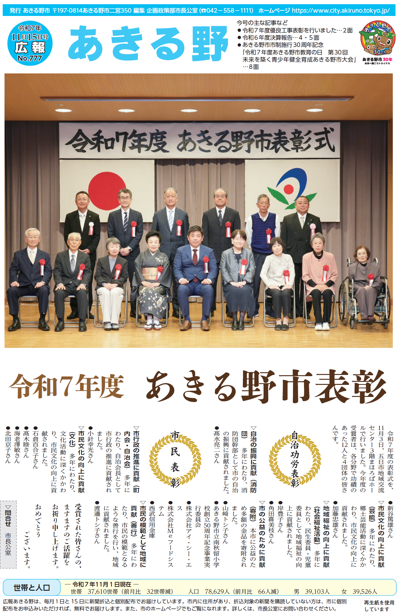 令和7年度 あきる野市表彰 令和7年度の表彰式を、11月3日、五日市地域交流センター3階まほろばホールで行いました。今年度の受賞者は、各分野で功績のあった12人と4団体の皆さんです。 ■自治功労表彰 ▽自治の振興に貢献(消防団) 多年にわたり、消防団幹部として市の自治の振興に貢献されました。 ●髙水亮二さん ■市民表彰 ▽市行政の推進に貢献(町内会・自治会) 多年にわたり、自治会長として市行政の推進に貢献されました。 ●小針...