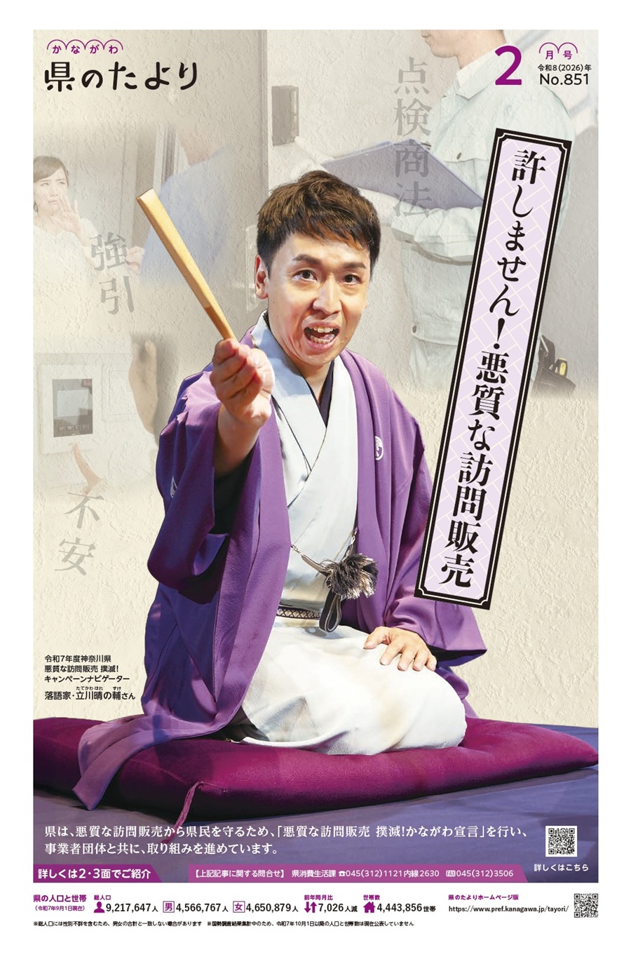 許しません! 悪質な訪問販売 令和7年度神奈川県 悪質な訪問販売 撲滅! キャンペーンナビゲーター 落語家・立川晴(たてかわはれ)の輔(すけ)さん 県は、悪質な訪問販売から県民を守るため、「悪質な訪問販売撲滅!かながわ宣言」を行い、事業者団体と共に、取り組みを進めています。 詳しくは本紙2・3面でご紹介 上記記事に関する問合せ:県消費生活課 【電話】045-312-1121内線2630【FAX】045-312-3506