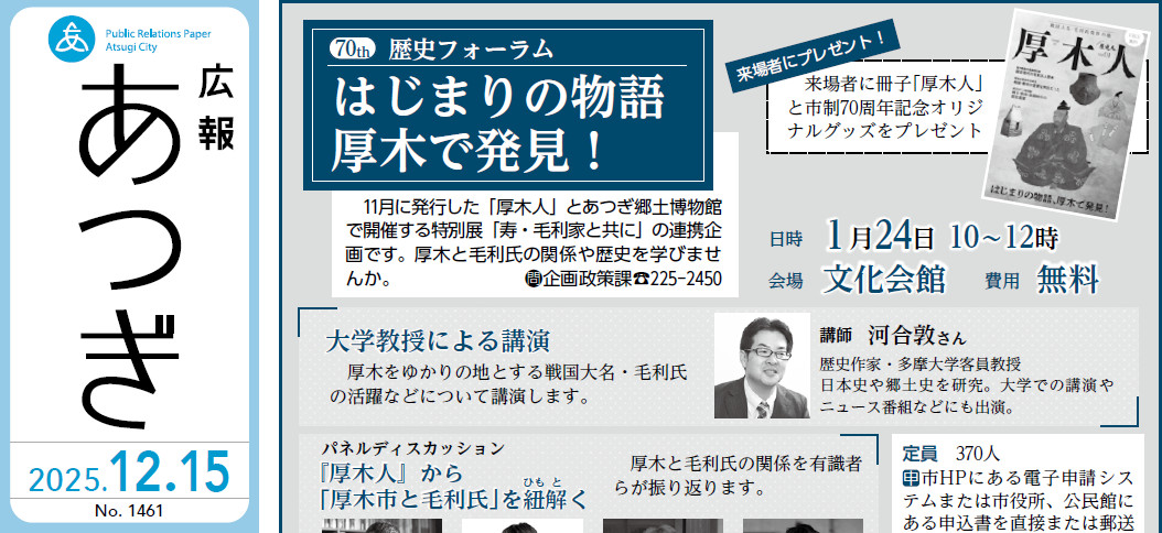 市制70周年記念事業 歴史フォーラム はじまりの物語 厚木で発見! 11月に発行した「厚木人」とあつぎ郷土博物館で開催する特別展「寿・毛利家と共に」の連携企画です。厚木と毛利氏の関係や歴史を学びませんか。 日時:1月24日 10~12時 会場:文化会館 費用:無料 ◆来場者にプレゼント! 来場者に冊子「厚木人」と市制70周年記念オリジナルグッズをプレゼント ■大学教授による講演 厚木をゆかりの地とする戦国大名・毛利氏の活躍などについて講演します。 講師:河合敦さん...