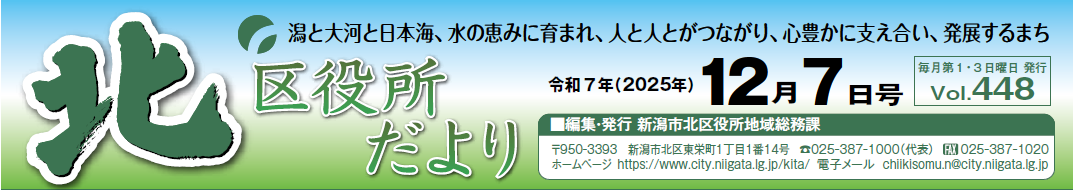 その他のお知らせ(北区役所だより 令和7年12月7日号) ◆市からの防災情報や緊急情報を受け取ることができます。 ・新潟市LINE(ライン)公式 ・にいがた防災メール ◆「美術を味わうレシピ展」21日(日)まで好評開催中! 日本画、洋画、水彩、デッサン、版画、彫刻、書、陶磁などさまざまなジャンルの美術が楽しめます。 14日(日)午前10時~作品鑑賞会も実施!詳しくは二次元コードから ◆電話番号は市外局番025を省略して記載しています。 ***** 潟と大...