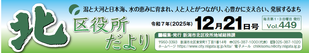 その他のお知らせ(北区役所だより 令和7年12月21日号) ◆北区郷土博物館で活動してみたい新規ボランティアを募集しています。 1月17日(土)午前9時半から説明会を行います。 ◆電話番号は市外局番025を省略して記載しています。 ***** 潟と大河と日本海、水の恵みに育まれ、人と人とがつながり、心豊かに支え合い、発展するまち 北区役所だより 令和7年(2025年)12月21日号 Vol.449 毎月第1・3日曜日発行 編集・発行:新潟市北区役所地域総務...