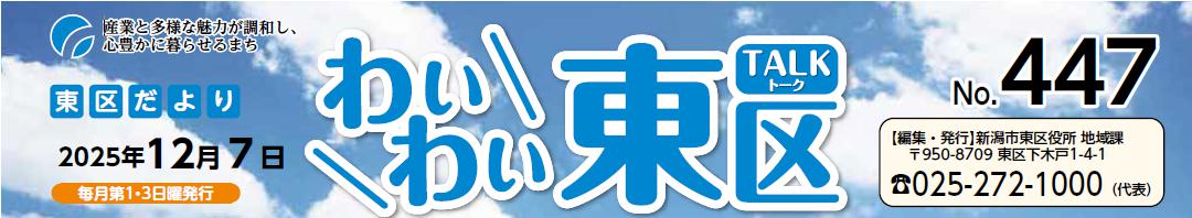 その他のお知らせ(わいわい東区 (令和7年12月7日)) ■東区だよりにお店や会社の広告を掲載しませんか。 対象は、「区内に本社や営業所がある事業者」です。詳しくはこちら ※詳細は本紙をご覧ください。 ■広告掲載の申し込みは地域課(【電話】025-250-2130)へ、1枠(3.9cm×7.9cm)15,000円。掲載した広告についての問い合わせは各広告主へ。 ■東区だより「わいわい東区」 2025年12月7日 No.447 毎月第1・3日曜発行 編集・...