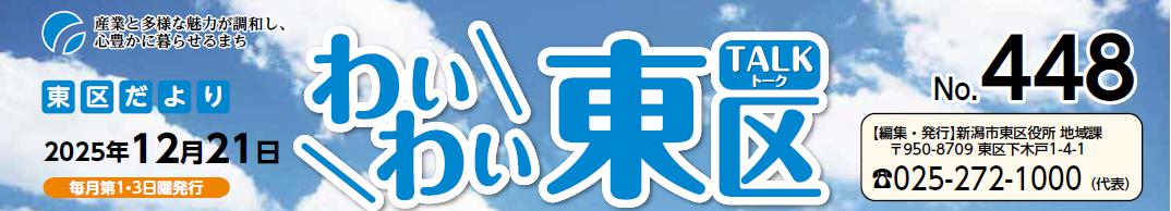 その他のお知らせ(わいわい東区 (令和7年12月21日)) ■東区だよりにお店や会社の広告を掲載しませんか。 対象は、「区内に本社や営業所がある事業者」です。詳しくはこちら ※詳細は本紙をご覧ください。 ■東区だより「わいわい東区」 2025年12月21日 No.448 毎月第1・3日曜発行 編集・発行:新潟市東区役所 地域課 〒950-8709 東区下木戸1-4-1 【電話】025-272-1000(代表)