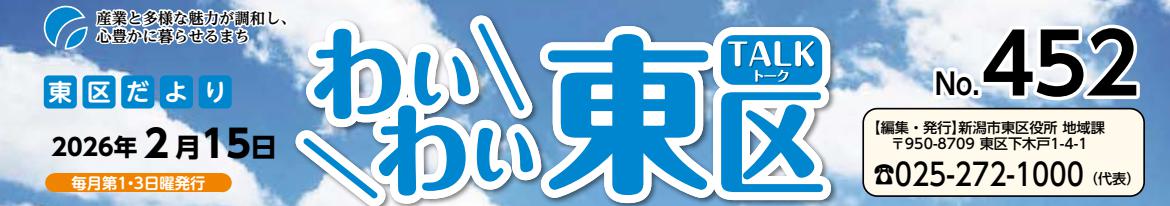 その他のお知らせ(わいわい東区 (令和8年2月15日)) ■東区だよりにお店や会社の広告を掲載しませんか。 対象は、「区内に本社や営業所がある事業者」です。 広告掲載の申し込みは地域課(【電話】025-250-2130)へ、1枠(3.9cm×7.9cm)15,000円。掲載した広告についての問い合わせは各広告主へ。 ■東区だより「わいわい東区」 2026年2月15日 No.452 毎月第1・3日曜発行 編集・発行:新潟市東区役所 地域課 〒950-870...